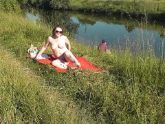 Wild beach. Sexy MILF Platinum naked sunbathing on river bank, random fisherman guy watches. Naked in public. Nude beach